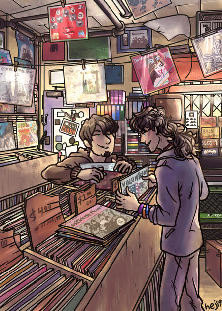 Inked-and-painted illustrations including a fullbody of 1-2 characters in a fully-rendered scene